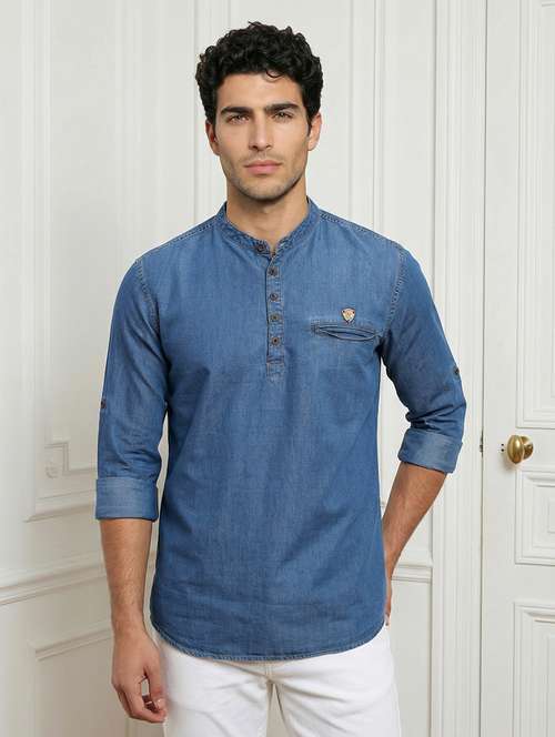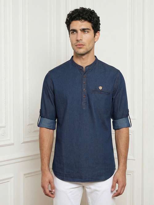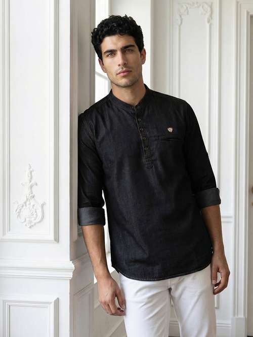 Step up your style game with this Men’s Black Denim Short Kurta Shirt, designed for men who prefer a bold yet effortless look. Crafted from premium denim fabric, it offers a breathable and comfortable feel while maintaining a structured, polished appearance. Designed in a regular fit, this kurta ensures ease of movement without compromising on style. The functional chest pocket adds practicality, and the roll-up sleeves give you flexibility to style it your way. Pair it with jeans for a rugged look or with chinos for a cleaner vibe—either way, this kurta delivers effortless style with maximum impact.