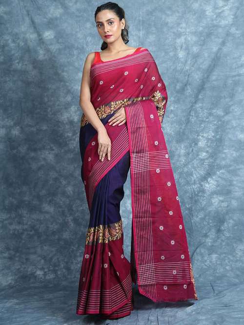 This is Floral Weaving Navy Blue And Magenta Handloom Saree With Unstitched Blouse from Charukriti