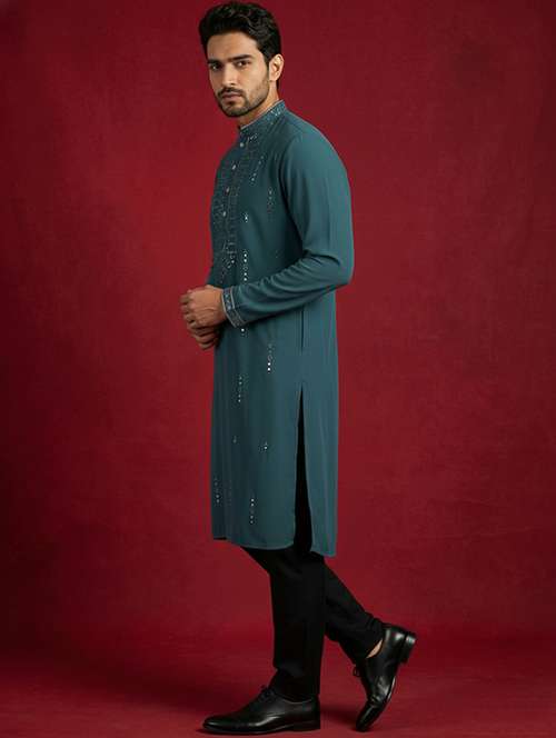 Imported Japanese Fabric kurta pyjama set featuring elegant tonal embroidery with subtle sequin accents. Designed with a mandarin collar and straight fit for a refined festive and wedding look.
