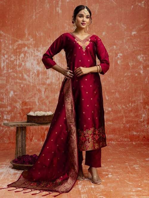 • Browse through the latest range of ethnic sets for women with tailored sleeve designs with zari works.