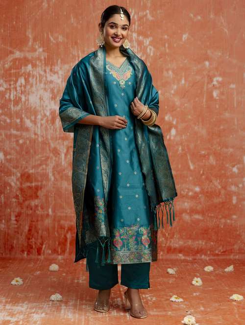 • Find gorgeous sets of ethnic wears in trending designs in blue colors suitable for festive wear of occasions.