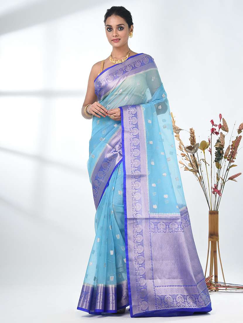 This exquisite saree is crafted from premium organza fabric, offering an elegant and lightweight feel. The rich sky blue color serves as a stunning backdrop for delicate floral motifs, intricately woven into the fabric, adding a touch of sophistication. The saree is bordered with a contrasting blue shade, beautifully accentuating its refined design. Its soft sheen creates a mesmerizing visual appeal, making it perfect for special occasions such as weddings, festive celebrations, or evening events.