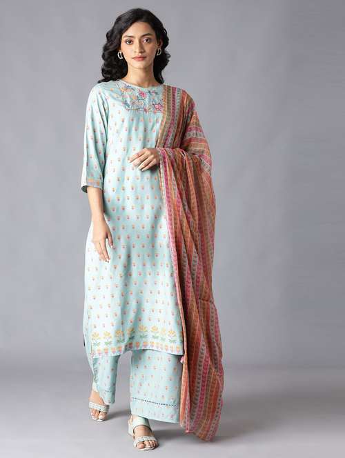 w women blue festive floral print rayon kurta with parallel pant & dupatta