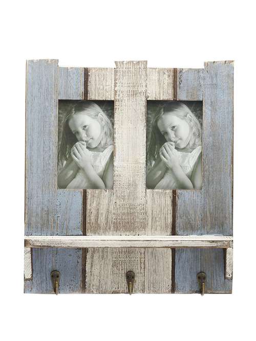 A dual purpose photo frame with key hook; This Wooden Blue twin Photo frame with Key Hooks; It is perfect to hang near your door to see you loved ones every time your leave the home