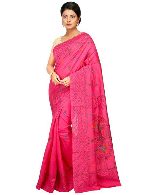 women pink embroidered saree with blouse