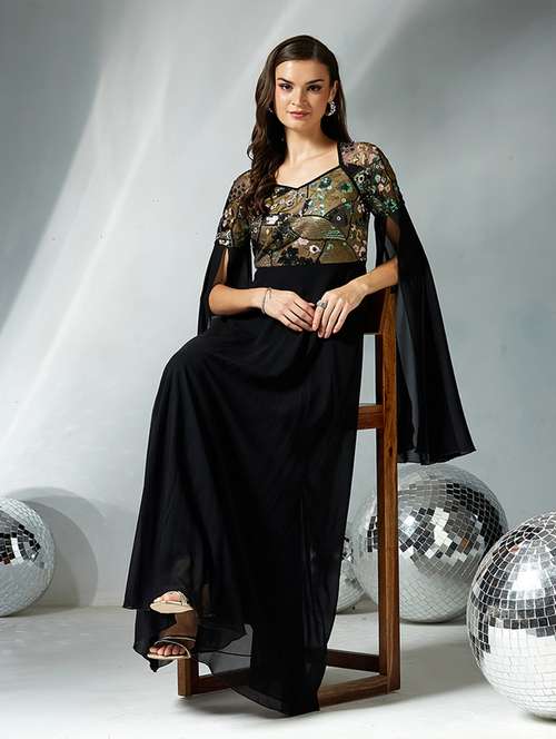 women embroidered cape sleeve fit & flare dress