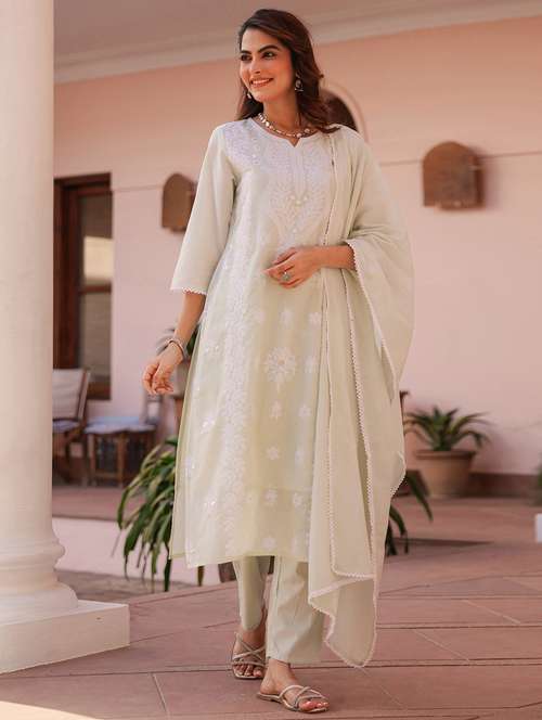 women solid with work three quarter sleeve kurta pant with dupatta set