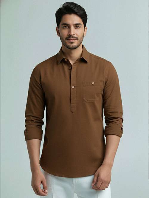 men solid long sleeve short kurta