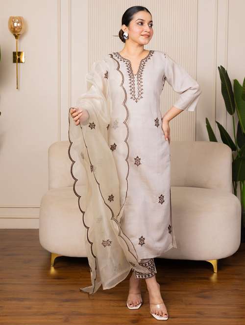 women solid with work three quarter sleeve kurta pant with dupatta set