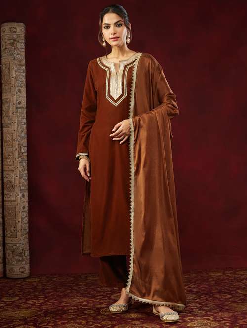 - Find gorgeous sets of ethnic wears in trending designs in brown colors suitable for festive wear of occasions.