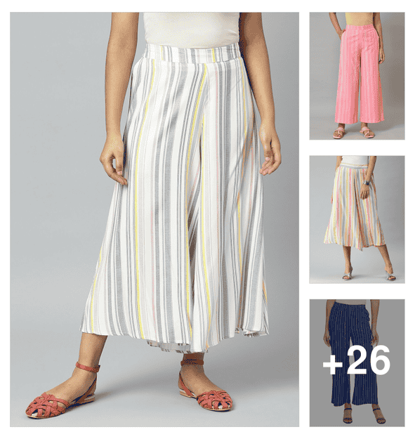 globus women indigo variegated stripes button detail mid-rise flared fusion palazzos