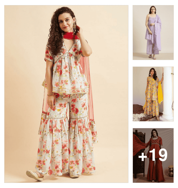 women printed three quarter sleeve kurta sharara with dupatta set