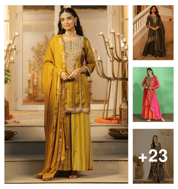 globus women black scalloped hem bell sleeves floral embroidered kurta & straight pant festive set