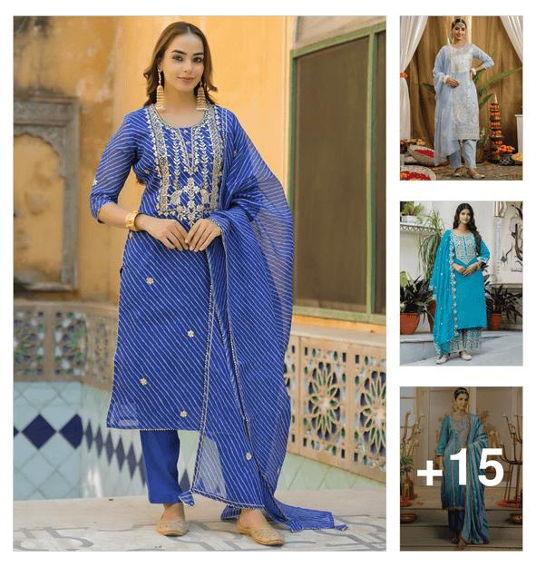 women solid with work three quarter sleeve kurta pant with dupatta set