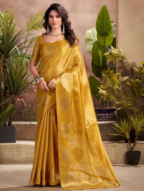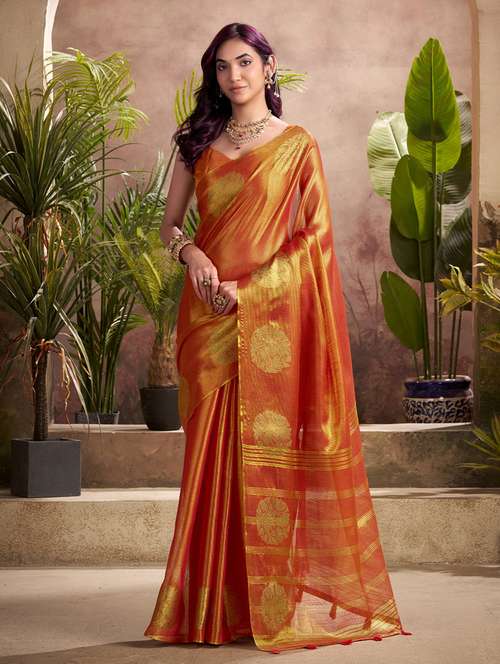 Crafted for the woman who loves to shine, this luxurious Tissue Silk saree from Sutriti is a masterpiece of light and texture. The saree features a high-sheen surface adorned with grand Gold Zari Circular (Mandala) motifs that float elegantly across the drape. The look is defined by a sophisticated pallu featuring horizontal zari stripes and finished with charming tassels.