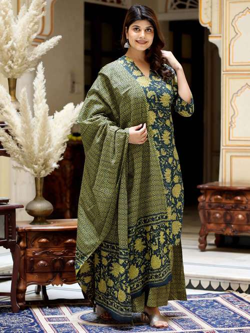 - Find gorgeous sets of ethnic wears in trending designs in green colors suitable for casual wear of occasions.