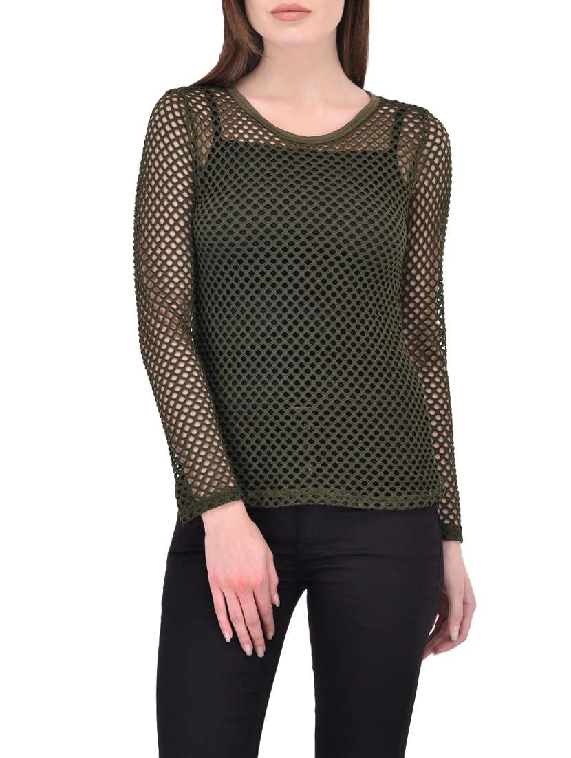 Double your fashion flair when you wear this Green coloured top by SVT ADA COLLECTIONS. Made from net, this regular fit top will keep you comfortable in summers. Team it with black coloured shorts for a sassy look.