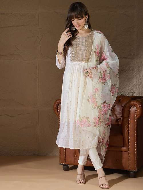 - Browse through the latest range of ethnic sets for women with tailored sleeve designs with embroidered works.