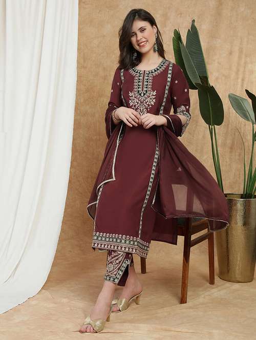 - Find gorgeous sets of ethnic wears in trending designs in maroon colors suitable for festive wear of occasions.