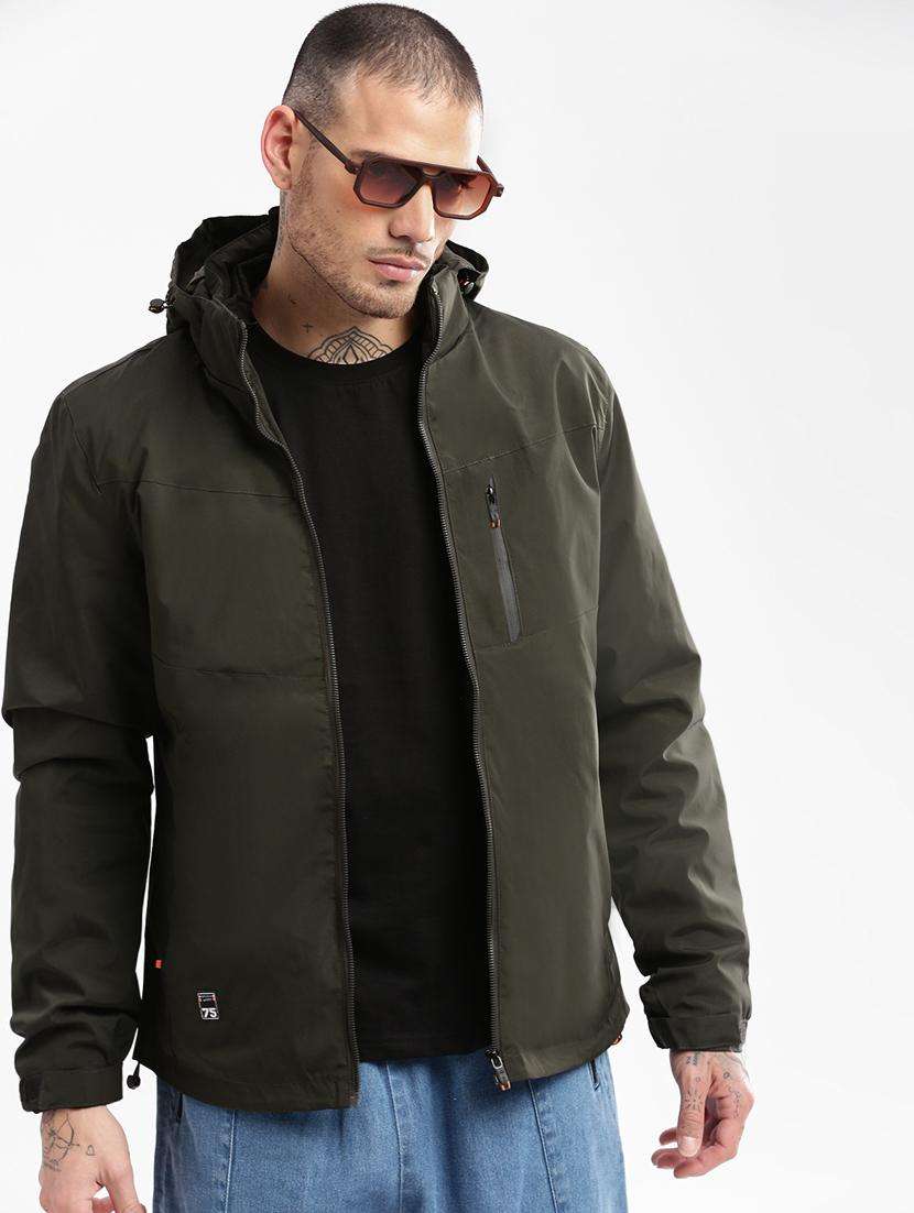 solid olive green detailed hooded casual jacket