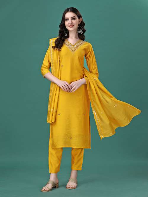- Browse through the latest range of ethnic sets for women with tailored sleeve designs with embroidered works.