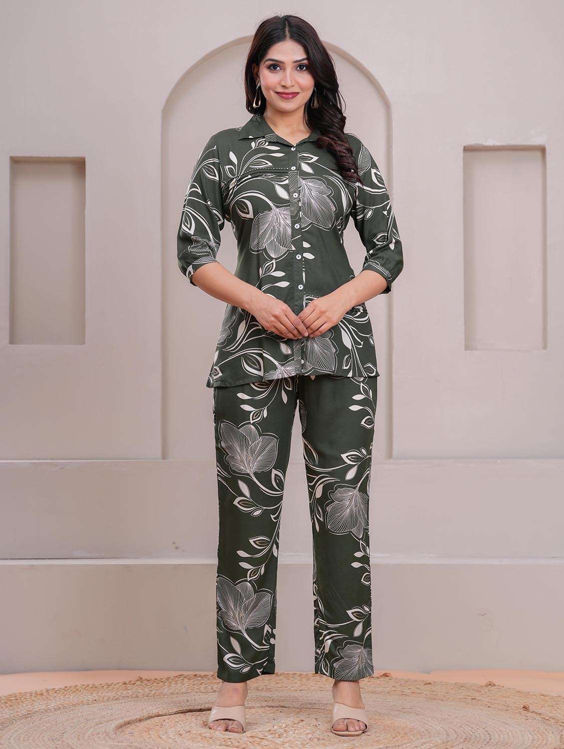- » women floral three quarter sleeve shirt & trouser co-ord set