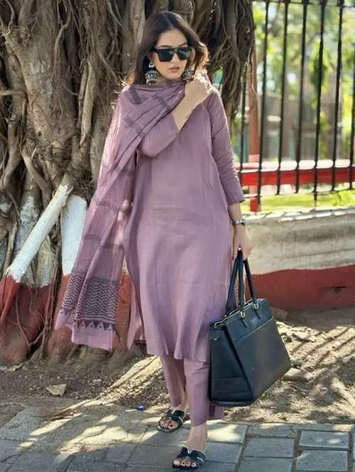 • Find gorgeous sets of ethnic wears in trending designs in purple colors suitable for casual wear of occasions.