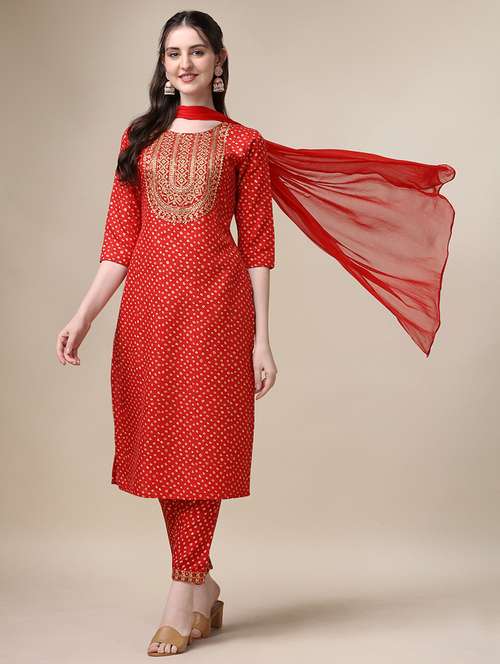 • Find gorgeous sets of ethnic wears in trending designs in red colors suitable for casual wear of occasions.