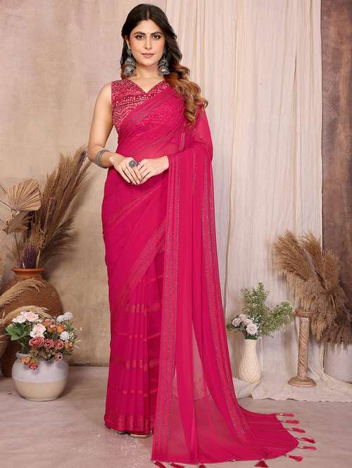Women’s Red Georgette Subtle Shimmer Woven Stripes Saree is a timeless choice for traditional and party occasions. The rich red color combined with subtle shimmer stripes creates a striking and graceful appearance. Crafted from high-quality georgette, this saree offers comfort and fluid draping. The designer tassel pallu adds a luxurious touch, and the matching blouse piece completes the ethnic ensemble. Keywords: red georgette saree, party wear saree for women, traditional saree, shimmer woven saree, blouse piece saree.