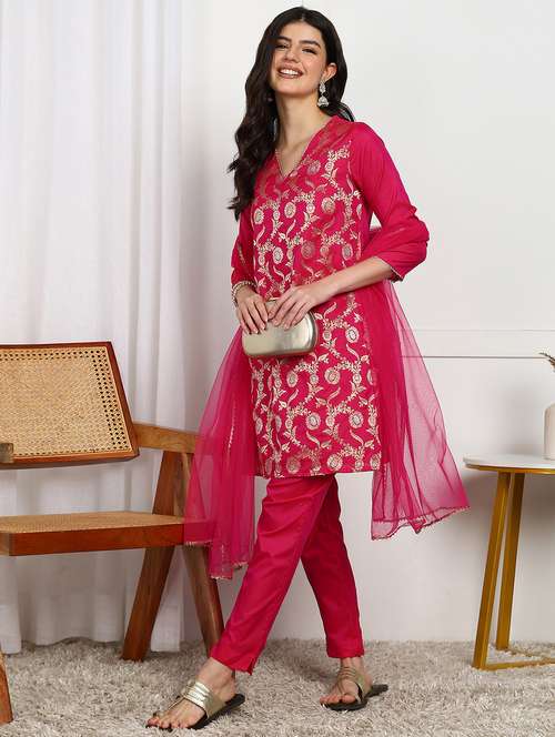 - Browse through the latest range of ethnic sets for women with tailored sleeve designs with jacquard works.