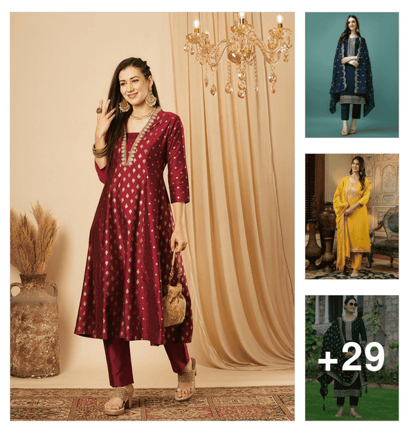 women green sequinned zari embroidered yoke a-line kurta with pant & contrast dupatta set