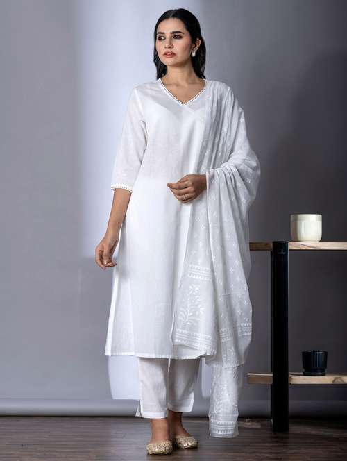 - Find gorgeous sets of ethnic wears in trending designs in white colors suitable for casual wear of occasions.