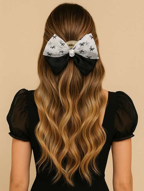This premium Korean-inspired bow hair claw is a perfect blend of elegance and functionality, designed exclusively for women who love to accessorize in style. The claw features a double-layer bow with a shimmering white fabric adorned with black bow motifs on top of a solid black layer, giving it a chic contrast. At the center sits a sparkling rhinestone embellishment that adds a touch of glamour to any hairstyle. The high-quality claw clip ensures a strong grip, making it suitable for both casual and party looks. Crafted for comfort and durability, this statement accessory is ideal for everyday wear, special occasions, and premium styling.