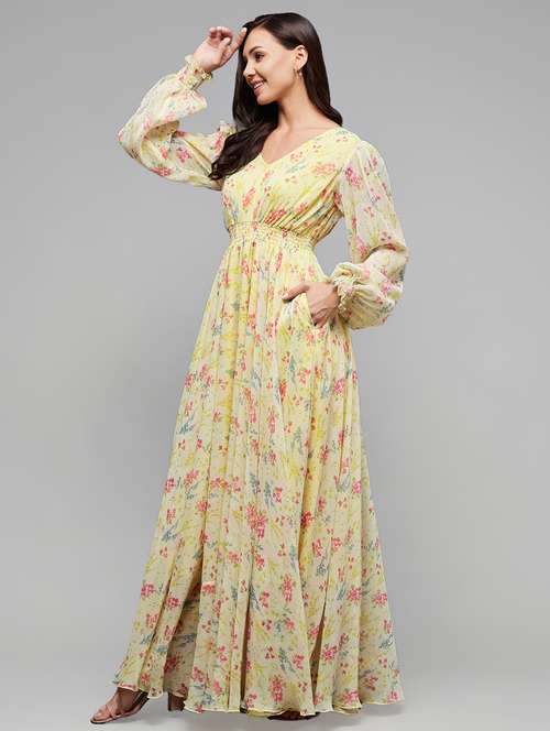Multicolored-Base-Lime Yellow Regular Length Floral Patterned Gathered Chiffon Maxi Dress. It Has Bishop Sleeve And V-Neck. It Has 2 Side Pockets.